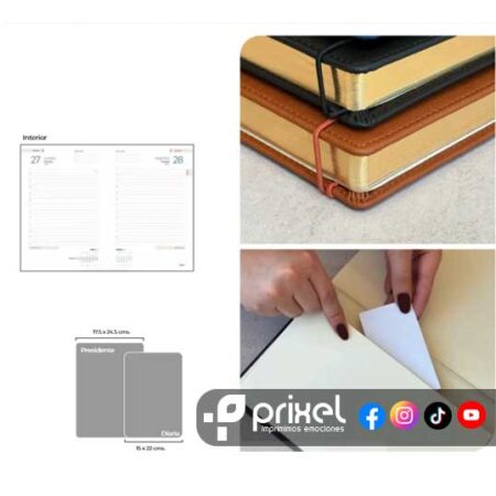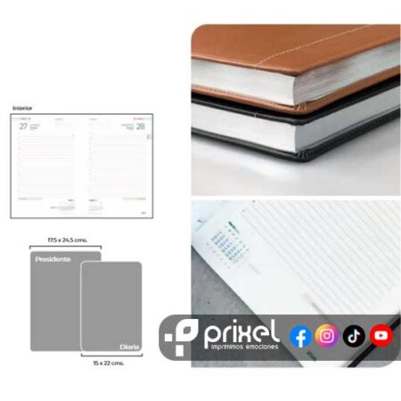 4- Tamaño: Elige el tamaño que mejor se adapte a tus necesidades. Contamos con agendas de Presidente más Ejecutivas o formales, que es el estándar y ideal para el uso diario, que son más grandes y adecuadas para quienes requieren más espacio para anotaciones o prefieren tener una agenda más prominente en su escritorio.