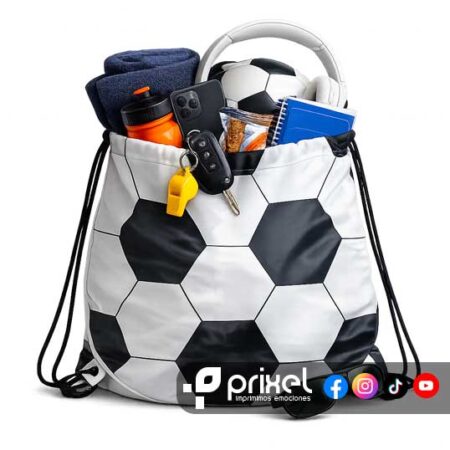 Descripción: Bolsa Mochila tipo saco con diseño de balón de fútbol, ligera y resistente. Con cordones ajustables