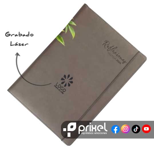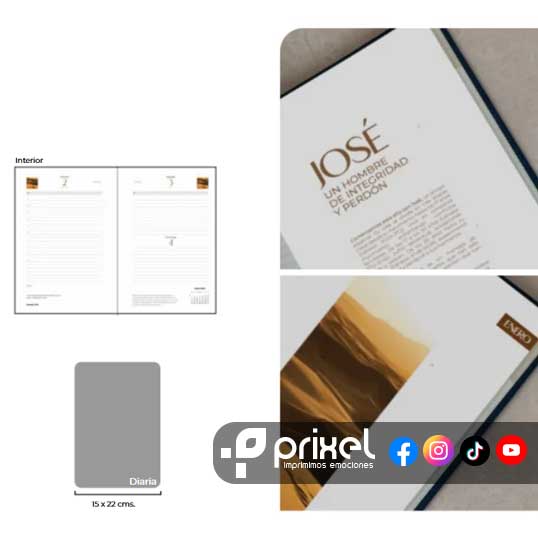 Canto plateado, guardas impresas, separador impreso, papel blanco 70g, impresión full color. Programador anual, programador mensual, esquinas redondeadas, día por página, diseños exclusivos. Incluye estuche.