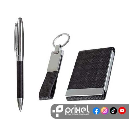 Tamaño: 2 x 12.7 cm Llavero / 1 x 13.4 cm Bolígrafo / 6.2 x 9.8 cm Tarjetero