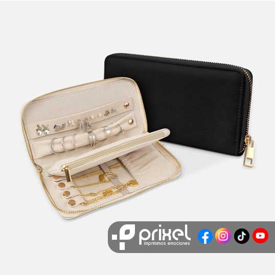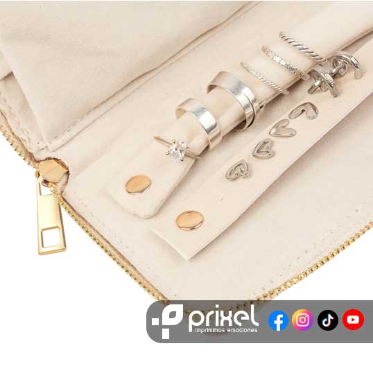 Descripción: Organizador de joyería para viaje con diseño tipo cartera. Cuenta con múltiples compartimentos internos para organizar anillos, aretes, collares y pulseras, incluyendo ganchos metálicos, bolsillo con cierre y bandas con broches. Cierre completo y formato compacto para llevarlo en bolsa o maleta sin ocupar mucho espacio.