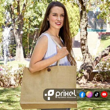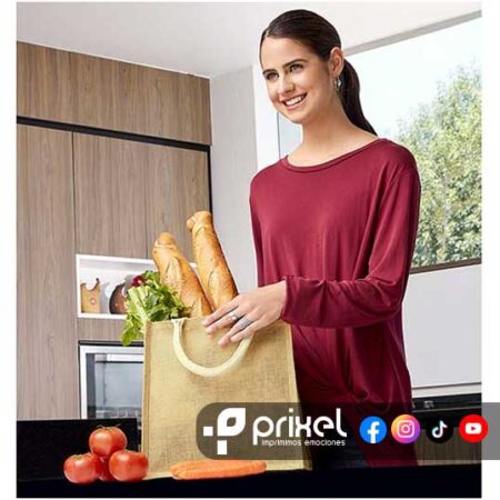 Descripción: Bolsa sin fuelle con asas. El yute es un producto natural el cual puede presentar variaciones en tonalidades y en la urdimbre y trama de la tela.