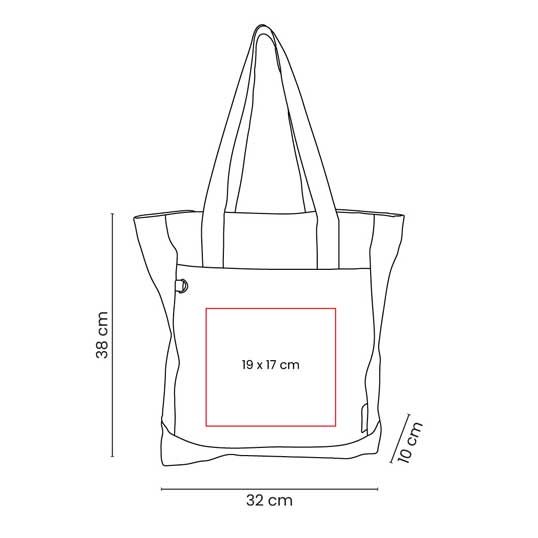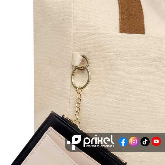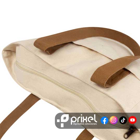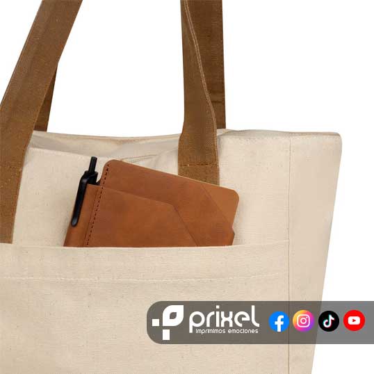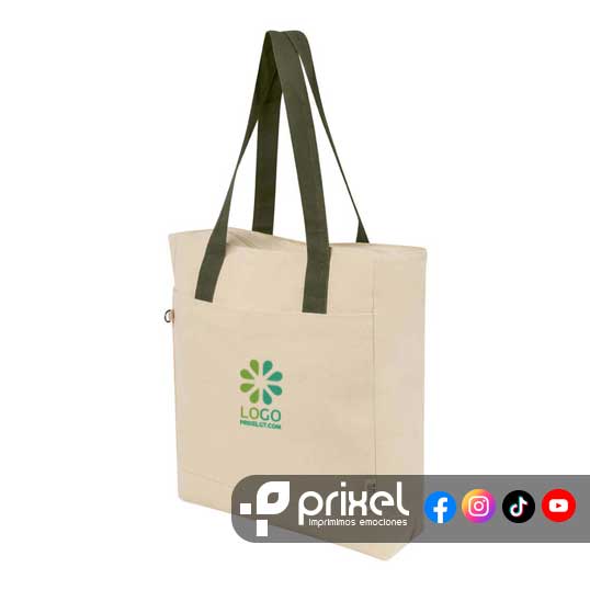 Descripción: Bolsa ecológica de algodón reciclado con fuelle y asas. Cuenta con un compartimento principal con cierre de gran capacidad, además de una bolsa frontal ideal para artículos de acceso rápido y argolla para colgar llaves o accesorios.