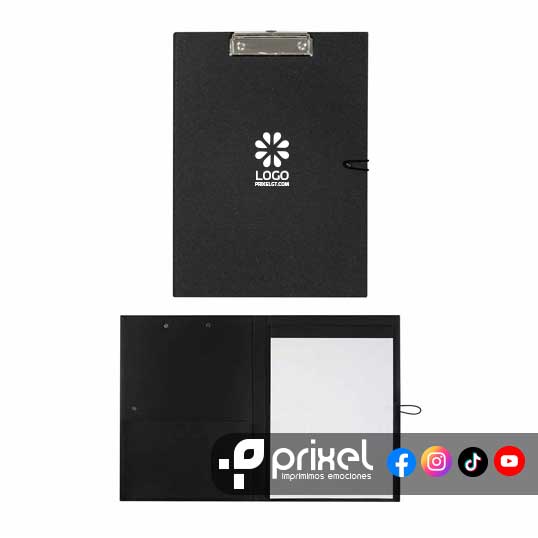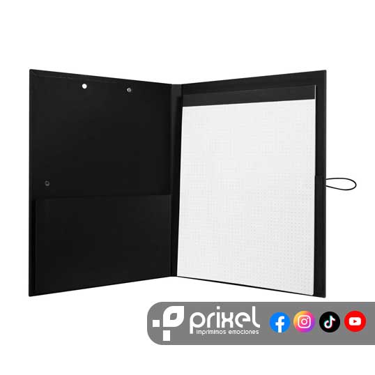 Carpeta con practico clip metálico y soporte retráctil en la parte superior. Incluye block de 30 hojas con retícula de puntos y compartimento interno. Su elástico ayuda a mantenerla cerrada y evitar extraviar documentos. Utilízala como carpeta o como tabla para encuestas, ideal para entornos profesionales o académicos.