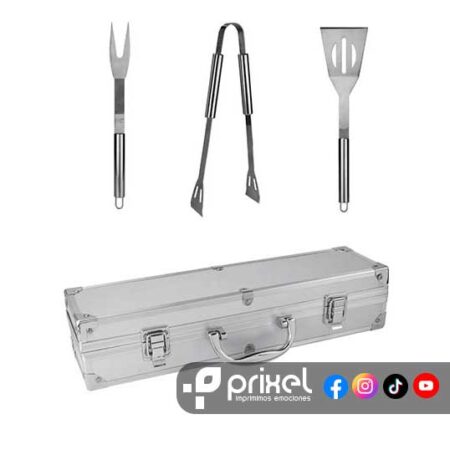 Incluye pinzas, brocha, espátula, cepillo de limpieza, tenedor, 2 brochetas y estuche.