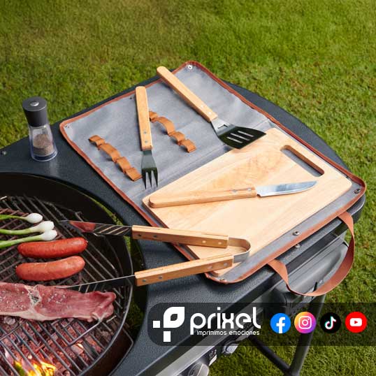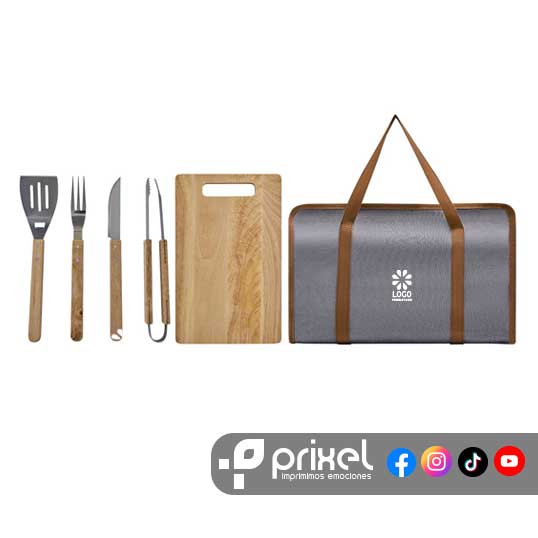 Material: Acero Inoxidable y Madera Caucho Utensilios / Poliéster Maletín