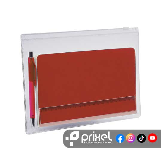 Set que incluye libreta con 64 hojas de raya, bolígrafo, regla de 20 cm y bolsa con cierre zip.