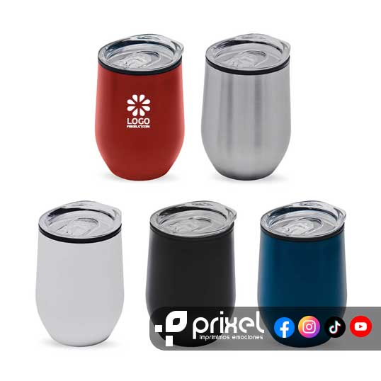 Vaso tipo tumbler doble pared. Pared interna plástico, pared externa acero inoxidable. Tapa de plástico con válvula de seguridad. Incluye caja individual.