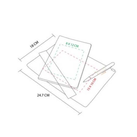 Área: 15 x 10 cm Bolsa / 8 x 12 cm Libreta