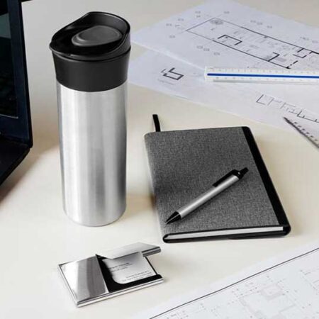 Material: Acero Inoxidable y Plástico Termo / Aluminio Bolígrafo / Metal Tarjetero