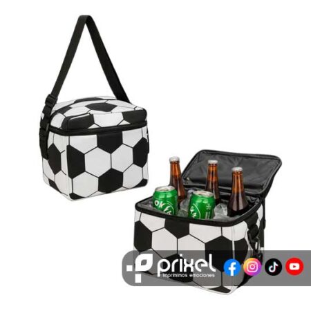 Descripción: Lonchera térmica con diseño de balón de fútbol. Cuenta con cierre superior, interior aislante y correa ajustable para fácil transporte.